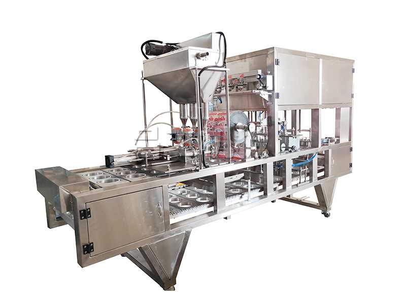本機采用合理的機械傳動,功能齊全,灌裝、封口、切邊、制品推出,廢料收卷,印碼等自動化工作,可節約人力,降低成本。本機有二次熱封裝置,料杯/碗/盒與封膜經過前后二次熱封,封口牢固可靠。
